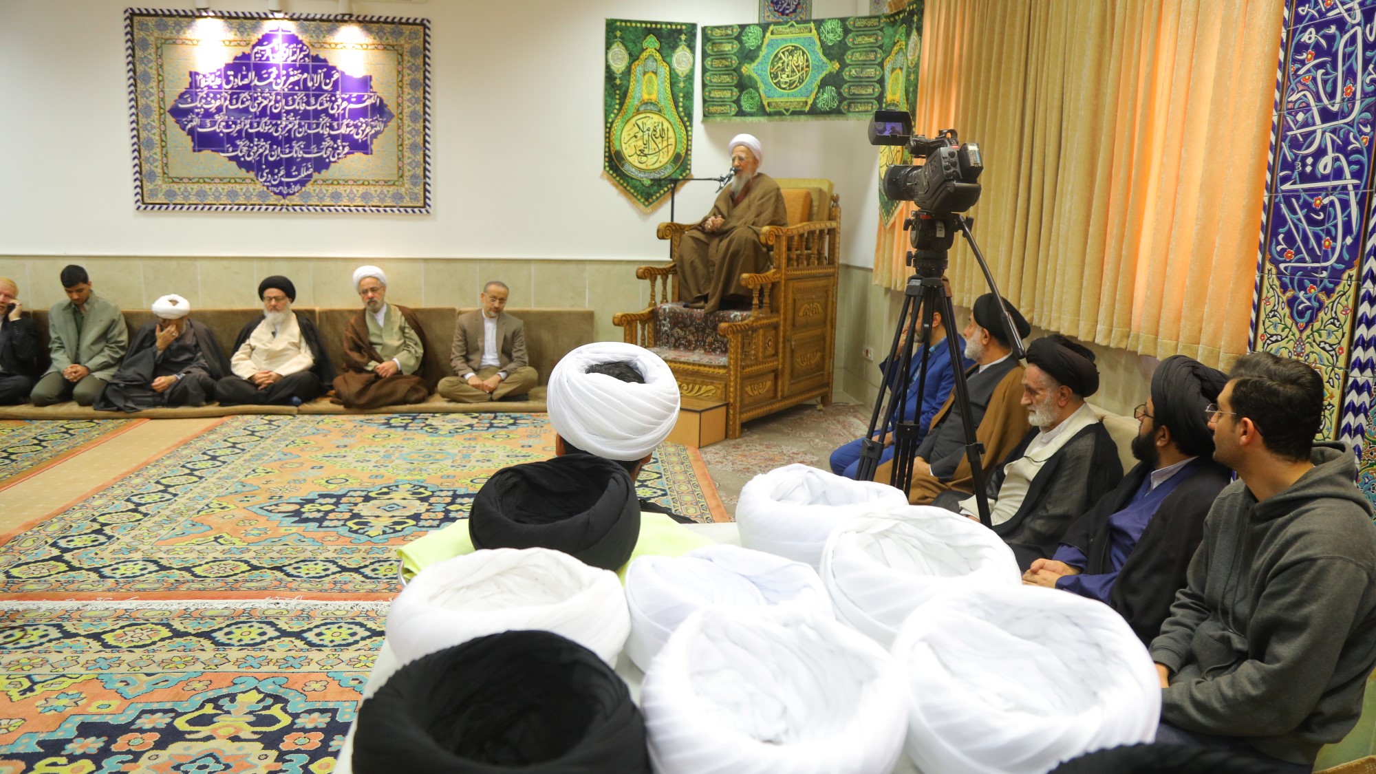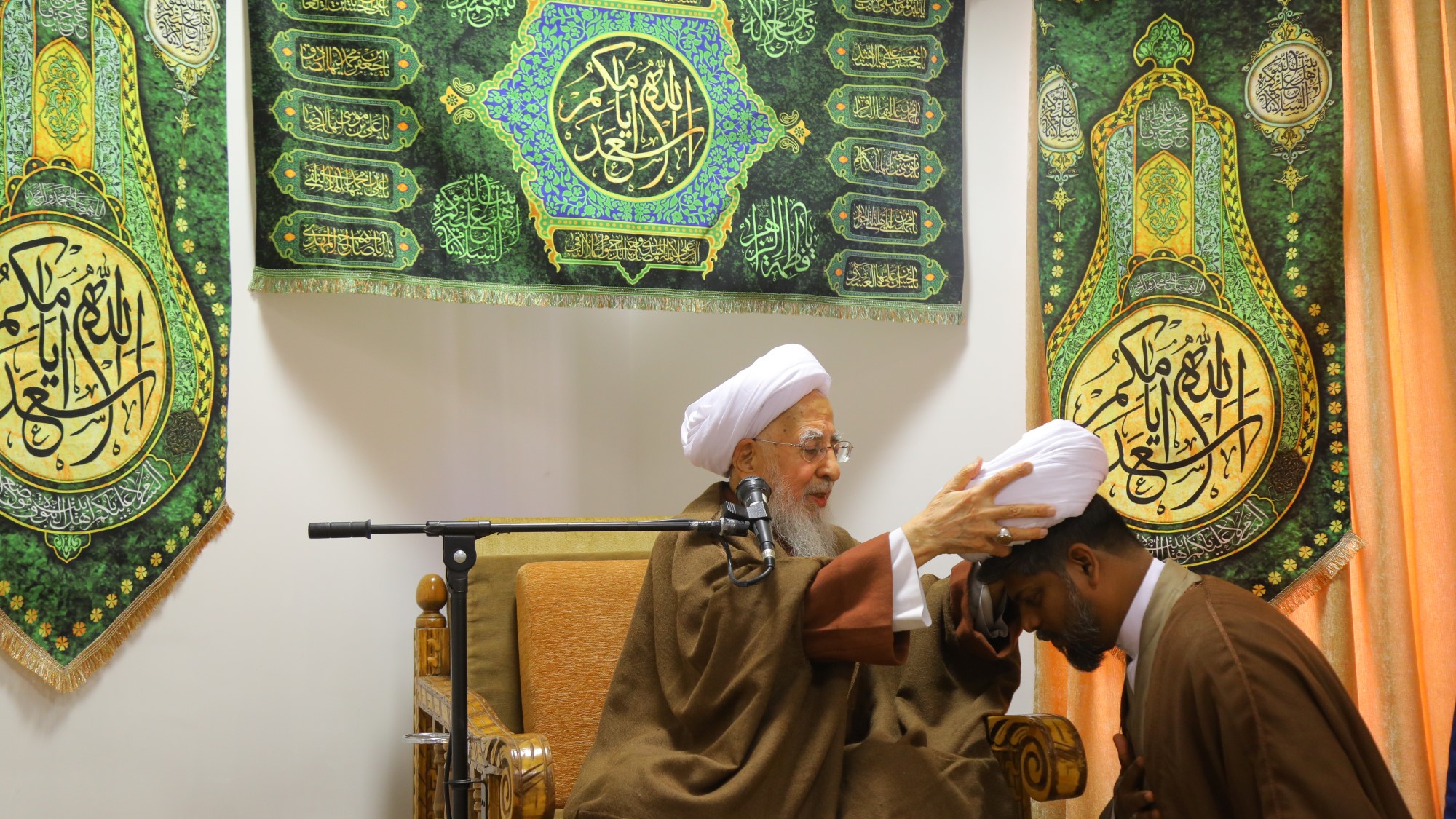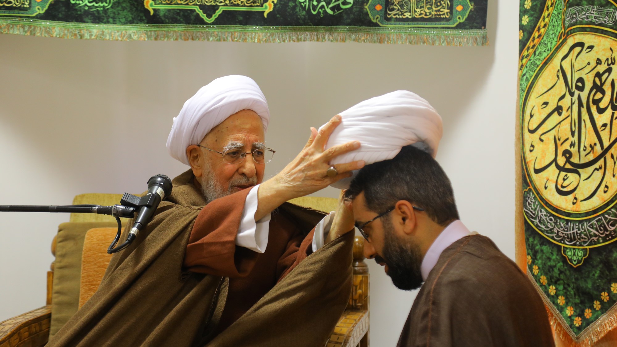 مراسم عمامه گذاری جمعی از طلاب توسط آیت الله العظمی جوادی آملی در سالروز 13 رجب