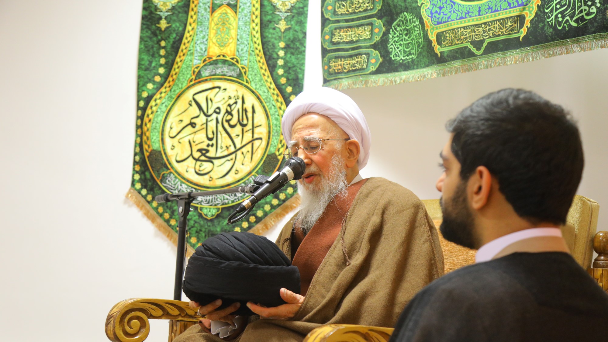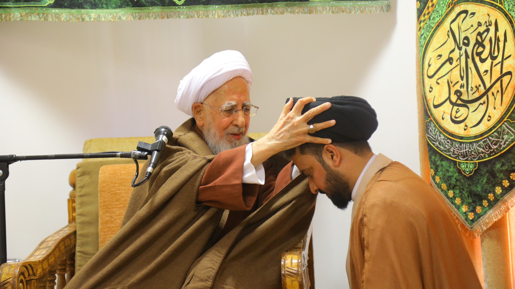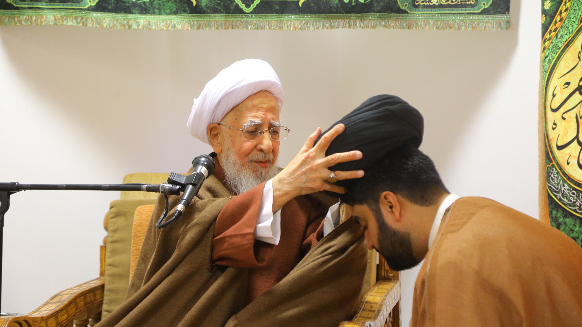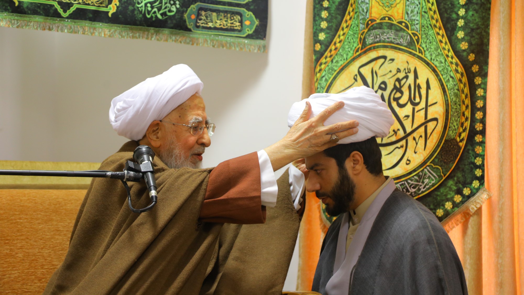 مراسم عمامه گذاری جمعی از طلاب توسط آیت الله العظمی جوادی آملی در سالروز 13 رجب - خبرگزاری اسراء