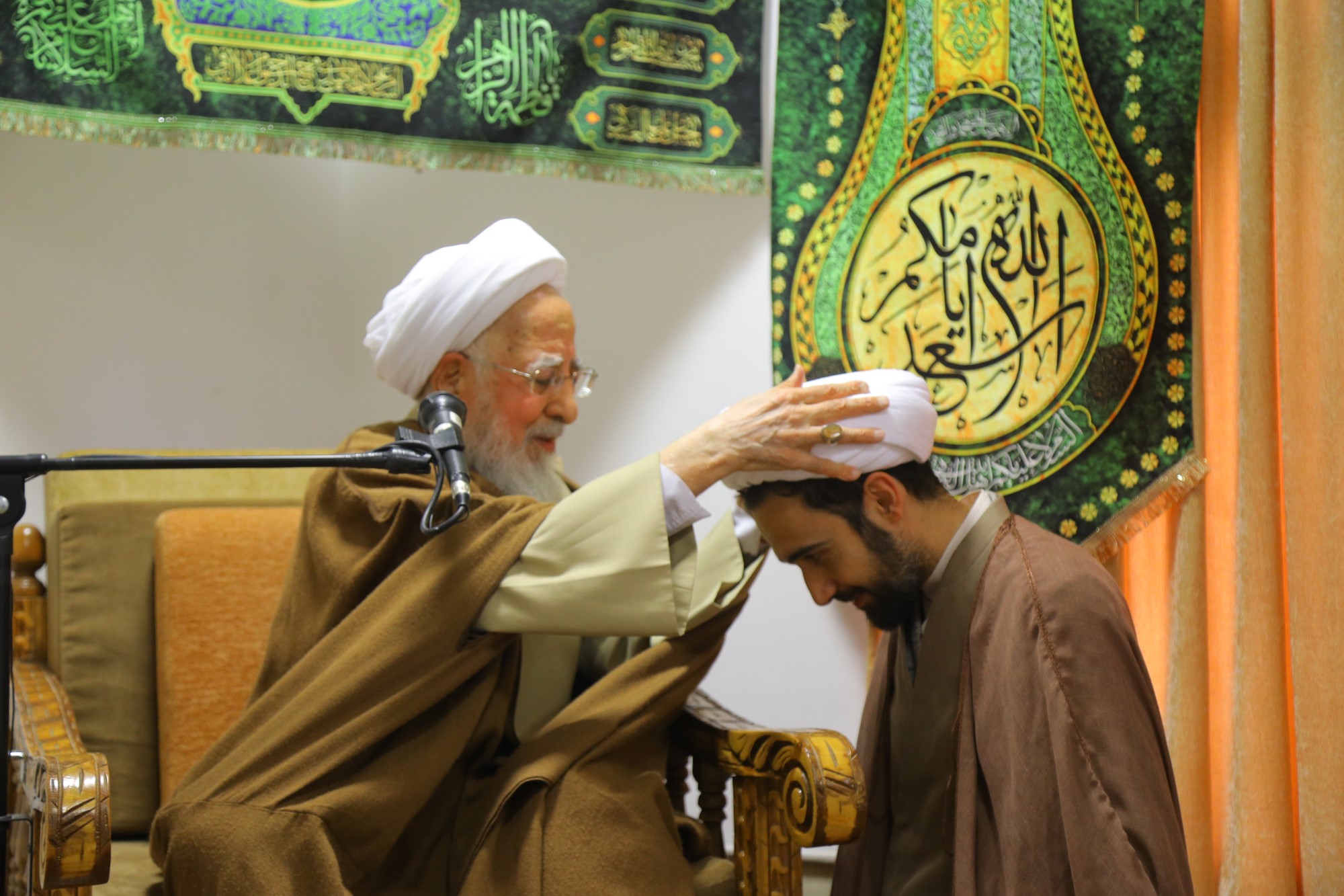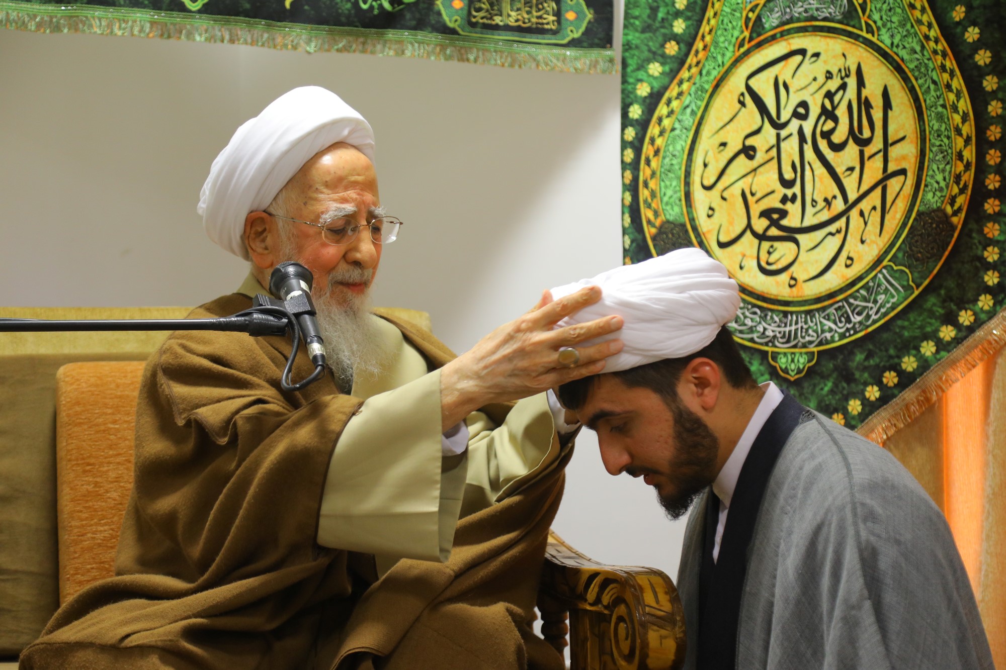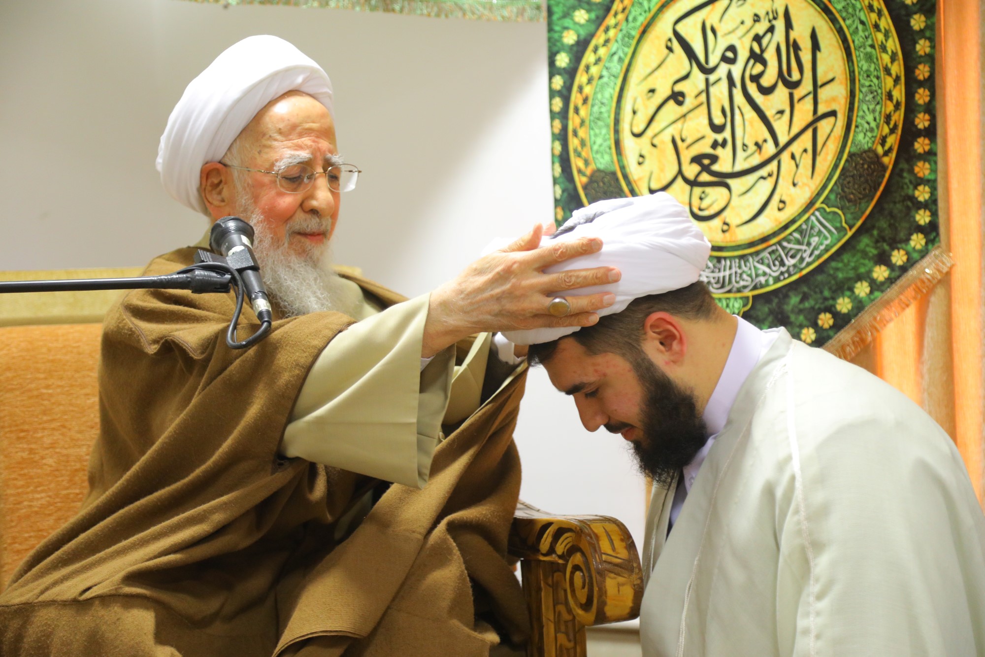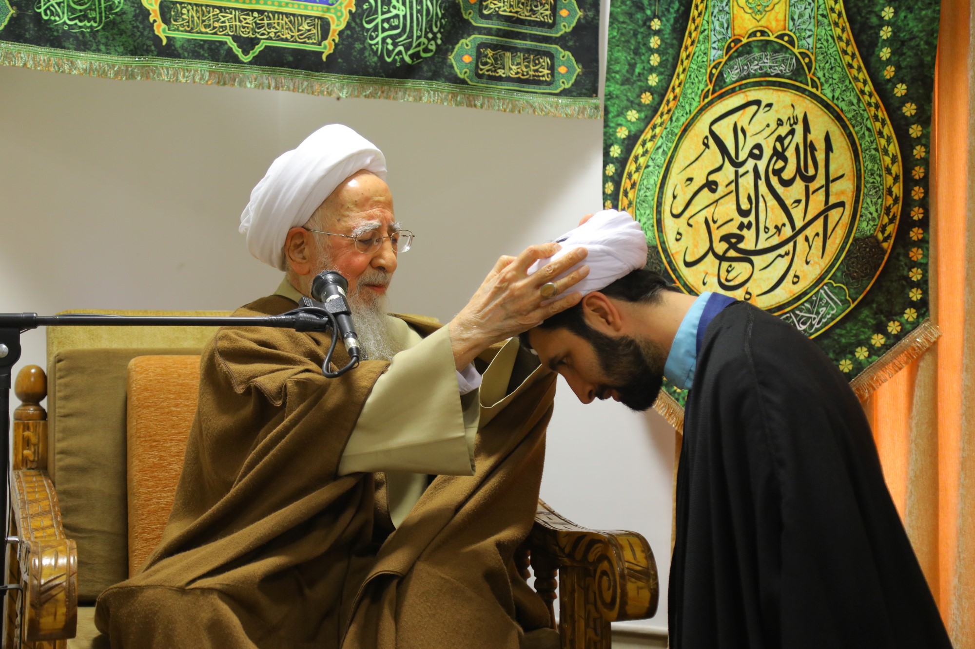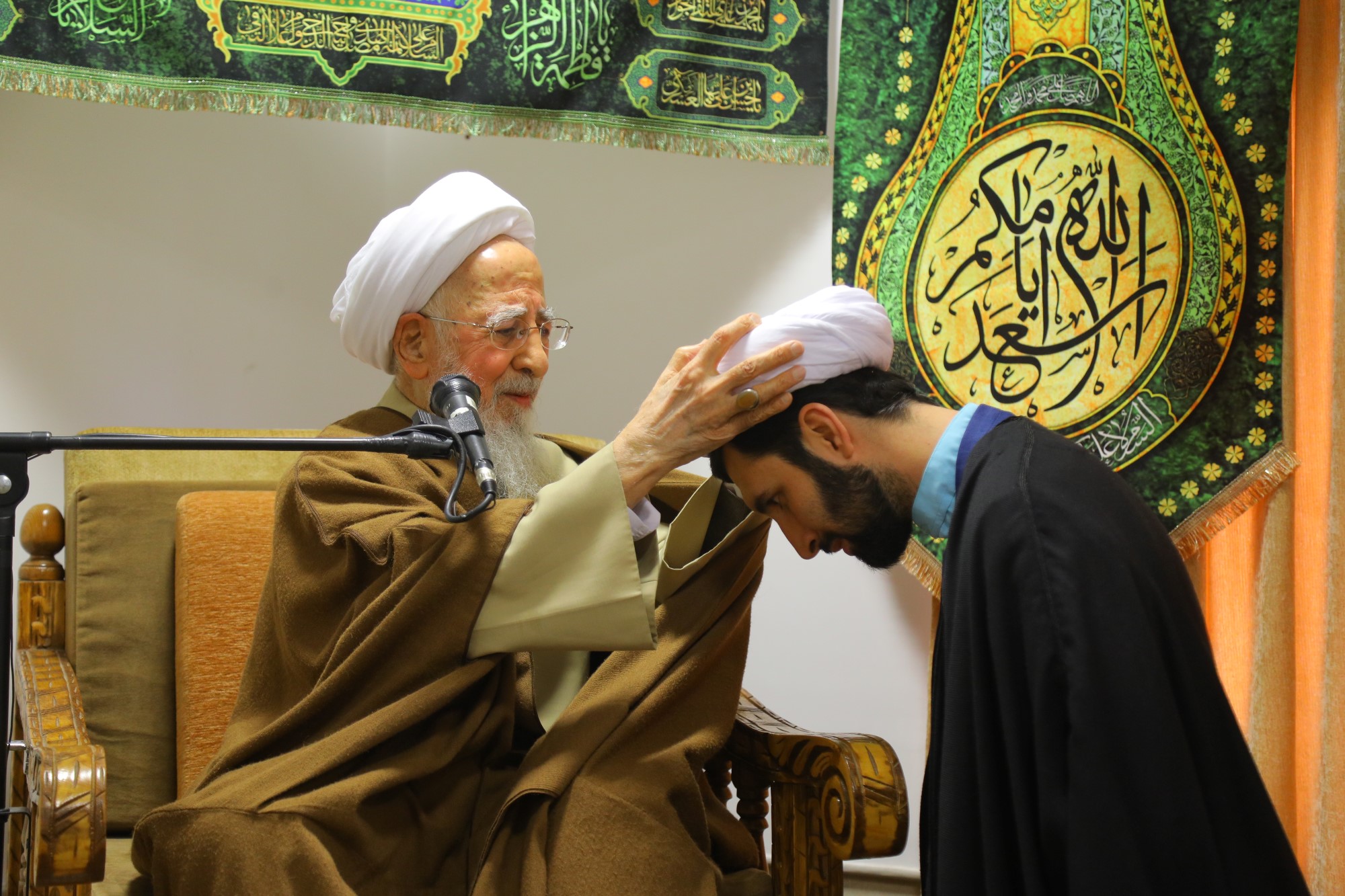 مراسم عمامه گذاری جمعی از طلاب توسط آیت الله العظمی جوادی آملی در نیمه شعبان