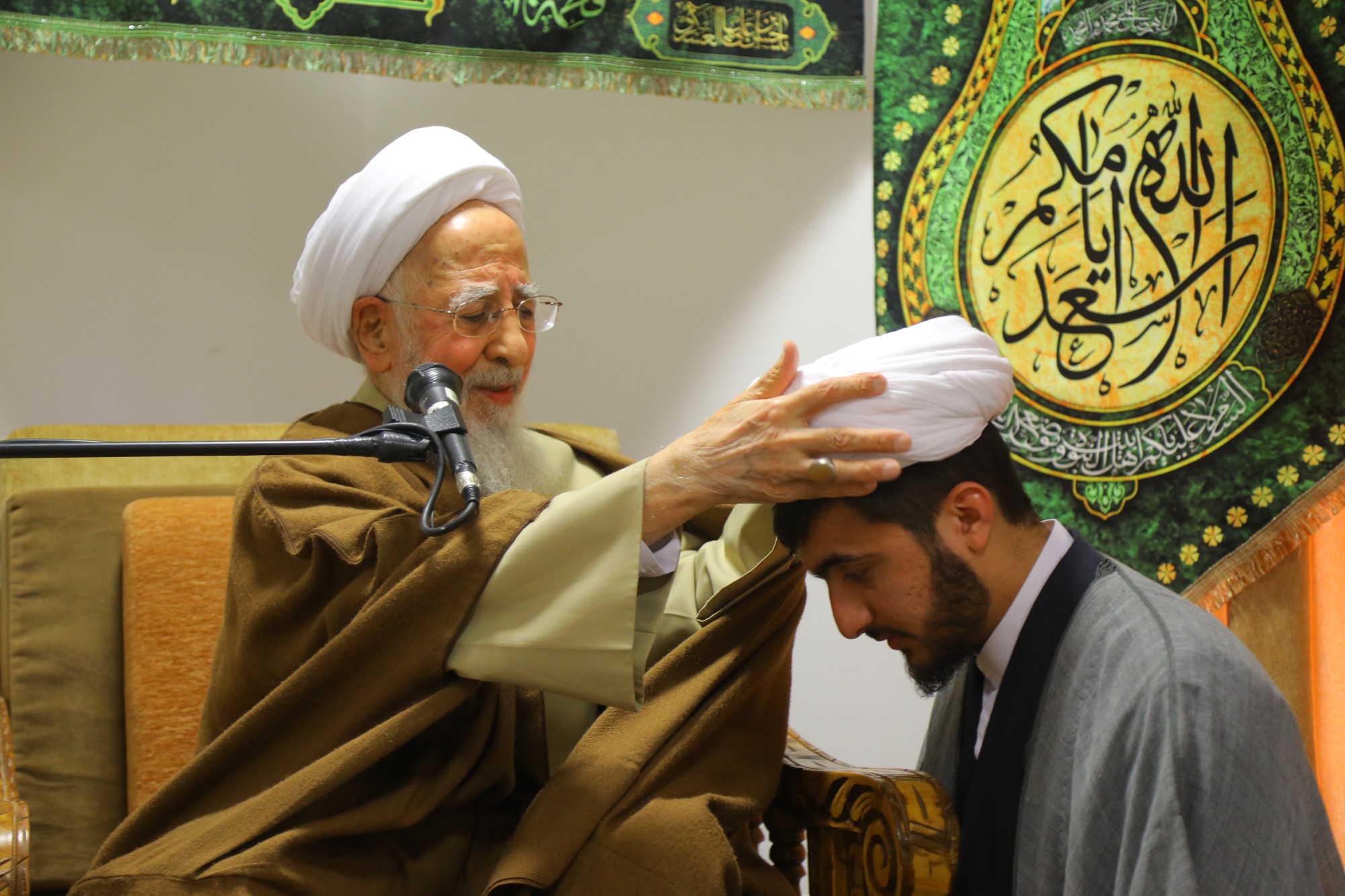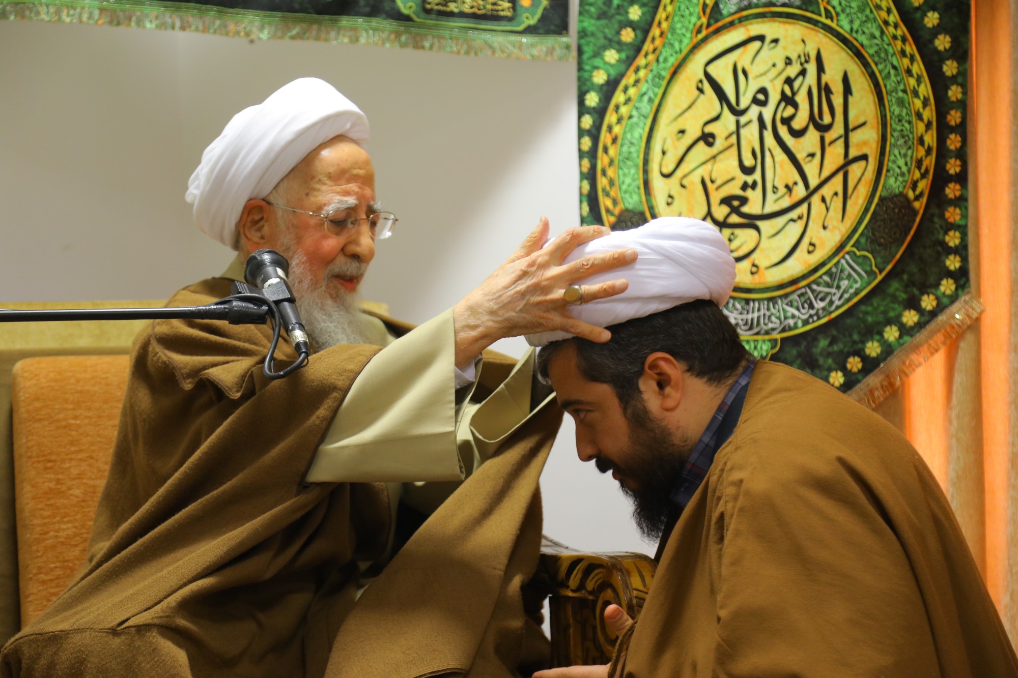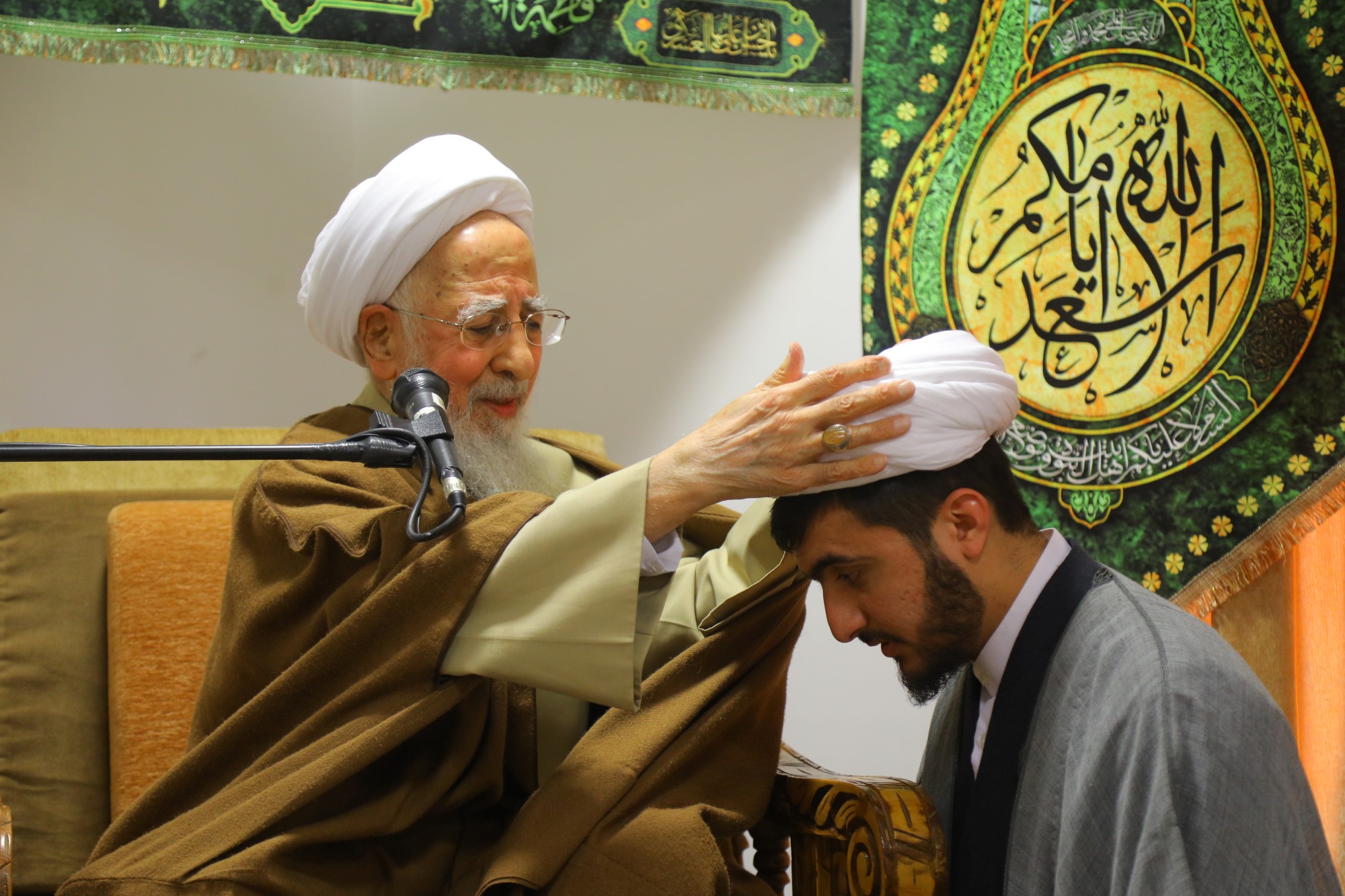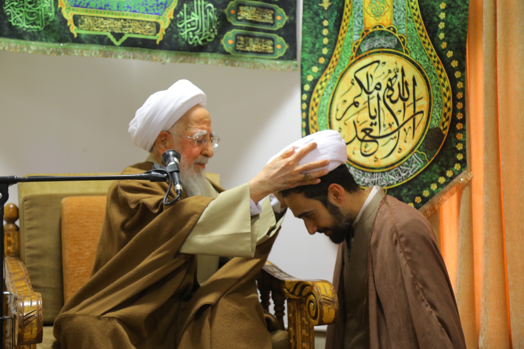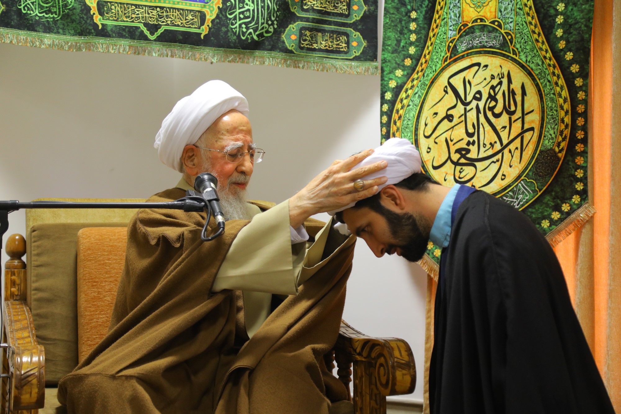 مراسم عمامه گذاری جمعی از طلاب توسط آیت الله العظمی جوادی آملی در نیمه شعبان