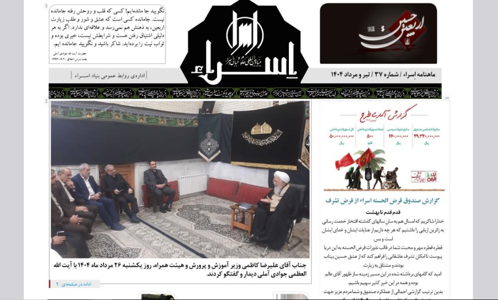 ​​​​​​​​​​​​​​پایگاه اطلاع رسانی اسراء: به همت اداره روابط عمومی بنیاد اسراء، ماهنامه اسراء که مروری است بر اخبار و فعالیت های ماهانه بنیاد اسراء (شماره 37، تیر و مرداد ماه 1404) آماده و منتشر شد.