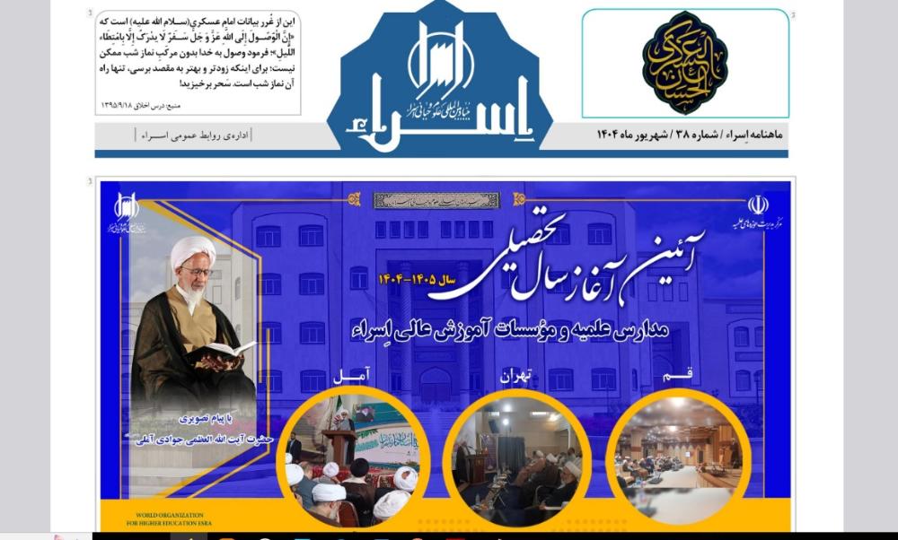 ​​​​​​​​​​​​​​پایگاه اطلاع رسانی اسراء: به همت اداره روابط عمومی بنیاد اسراء، ماهنامه اسراء که مروری است بر اخبار و فعالیت های ماهانه بنیاد اسراء (شماره 38، شهریور ماه 1404) آماده و منتشر شد.